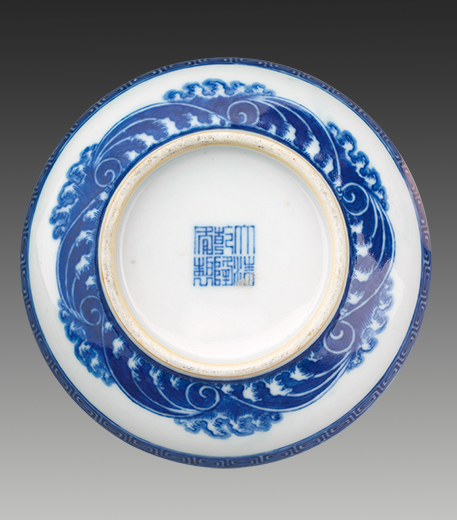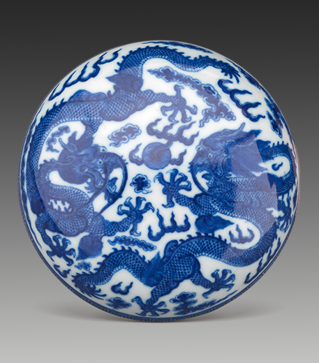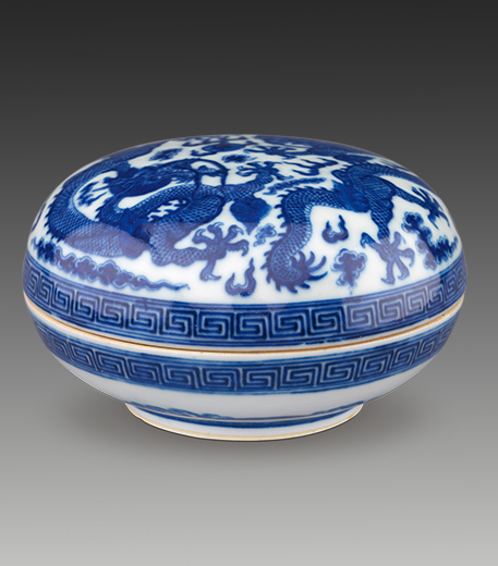 盒直口,斜弧腹,圈足。盖有子母口,圆弧状顶。盒身口沿下饰连续回纹一周,近足处饰青花海水纹饰。盖面饰青花双龙纹、云纹和回纹。青花色泽浓艳,所绘龙纹神态生动,线条遒劲有力,笔法精细工整,将龙身上的鳞片一一绘出。