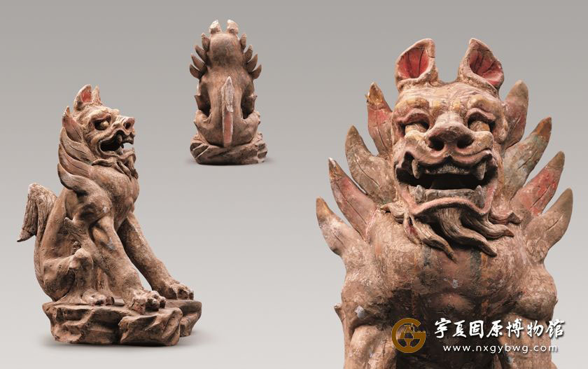 泥质灰陶,彩绘描金。蹲伏式,狮面。面目狰狞,张口卷舌,齿外露,鬃毛向上,两耳直竖,前肢趾爪张开撑地,尾巴向上翘起,尾端宽而下垂。