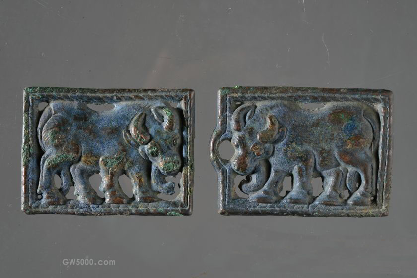 一组两件,两件构图一致。长方形,边框饰麦穗纹,中间透雕一伫立牛形图案,牛低首,圆眼凸起,弯角向上,肢体健硕,长尾下垂。