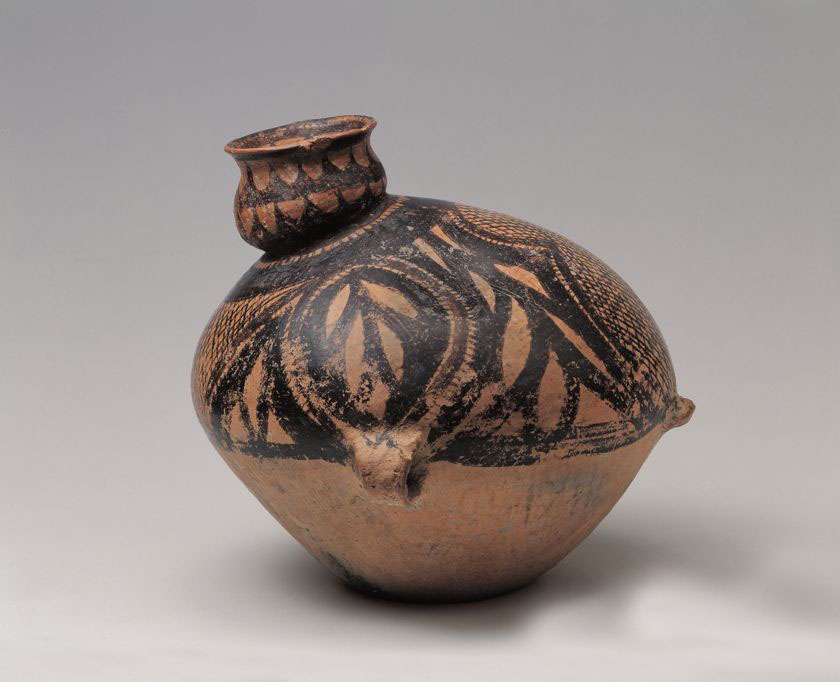(约5000年前) 高25厘米,口径27厘米,底径10厘米,1980年宁2固原县中河乡高坡村出土,泥质红陶,胎质薄而细。偏敞口外卷,圆唇,与口相对的一侧饰一把手。扁鼓腹,腹中部两侧饰有对称两桥形耳。口沿至腹部饰黑彩,颈部饰两4锯齿纹,正面肩、腹部饰两个三角形网纹,左右两侧饰近似圆形的树叶图案,内饰柳叶纹,树叶图案两边有豆荚纹,后肩、腹部饰有葫芦网纹。