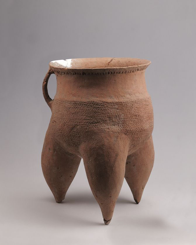 泥质红陶。敞口,圆唇,束颈素面。颈部饰单耳,分裆三袋足,通体饰粗布纹。