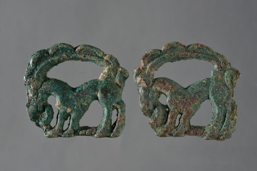 羚羊低首,圆眼,口微张,扁平环状角与尾相连接,肢体健壮,短尾上翘。造型生动逼真。