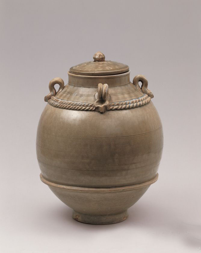 直口,带盖,肩部均等分布四个系耳,肩上部做出二周绳纹凸棱,腹下部做出一周凸棱。器型圆鼓,平底,器身有轮盘,弦月转痕迹,釉色泛青。