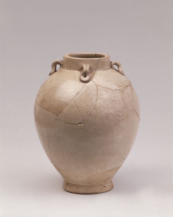 直口,微内敛,短颈方唇,肩部口沿交接处均有四耳,耳为两瓣重合状,耳际有一道弦纹。圆鼓腹,腹下逐渐内收,至底部外侈,假圈足。内外均施白釉,下腹部流釉泪,底部未施釉,露白色瓷胎。釉面有冰裂开片,口沿与肩部处釉色稍泛黄。