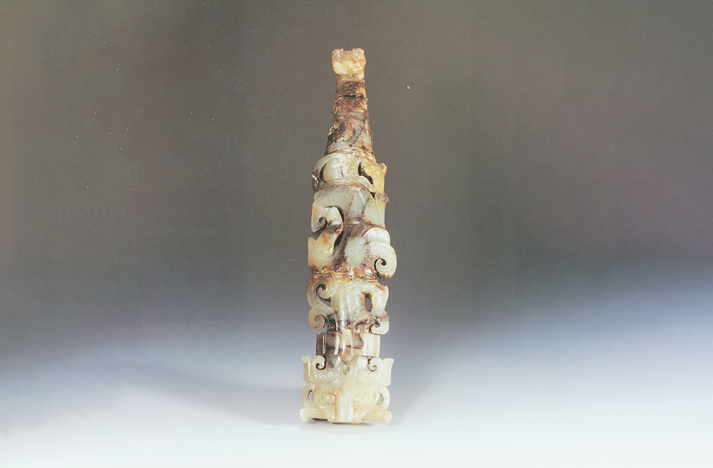 八节铁芯玉带钩出土自墓主人棺椁的头箱,所谓带钩,顾名思义就是古人束衣带的钩。这件带钩19.5厘米,重197.5克。由一根铁柱穿连8块玉而成。钩首为龙头,瘦瘦长长。钩尾为虎头,用一块玉细致地雕刻出老虎的凸眼、直鼻、獠牙、胡须、浓眉。钩身刻有鳞和鳍,和缭绕的云纹。
