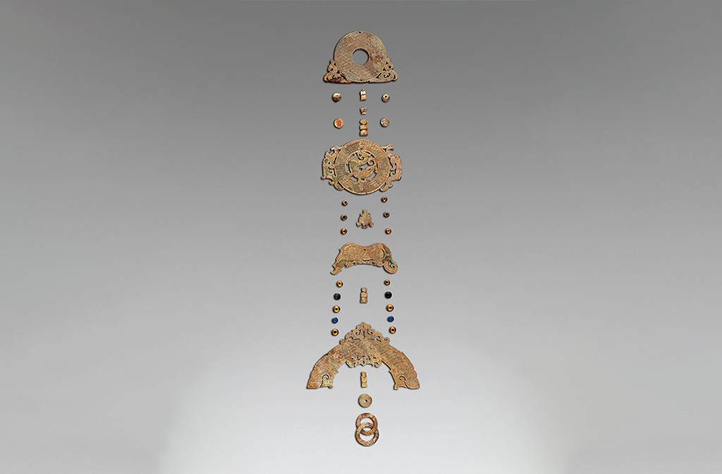组玉佩又叫玉佩组饰,是贵重的装饰品。南越王墓出土组玉佩11套。南越王的这一套最为华丽,共由玉、金、玻璃、煤精球等不同材料的32个饰件组成,以双凤涡纹璧、透雕龙凤涡纹璧、犀形璜、双龙浦纹璜4件玉饰自上而下为主件。中间配以4个玉人、5粒玉珠、4粒玻璃珠、2粒煤精珠、10粒金珠,玉套环居于最末端,形成一套大小有别、轻重有序、色彩斑斓的华贵配饰。