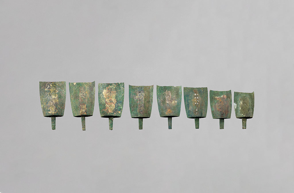 勾鑃是古吴越族的乐器。安徽、江苏、浙江、湖北、山东等地均有发现,江浙最多,即古时吴越文化的主要地区。勾鑃通常在祭祀和宴飨时来使用。演奏时,需设置底座来固定柄部,口部朝上,用槌敲击。 在南越王墓东耳室的北墙下,也出土了一套八件的铜勾鑃,重191公斤。在这些勾鑃的表面,都阴刻着两行平行的篆文“文帝九年乐府工造”,说明它们是在南越文帝赵眜在位第九年(即汉武帝元光六年,公元前129年)的时候由乐府制成的,同时也反映出南越国内也设有乐府这一音乐机构(因为汉朝的“文帝”是谥号,生前不用,这里只可能指南越文帝)。在这八字铭文的正下方,还分刻有“第一”到“第八”的序号,与其大小正好对应。铭文为“物勒工名”制度的体现,即实行责任问责,保证生产质量。这是岭南地区第一次发现青铜勾鑃。