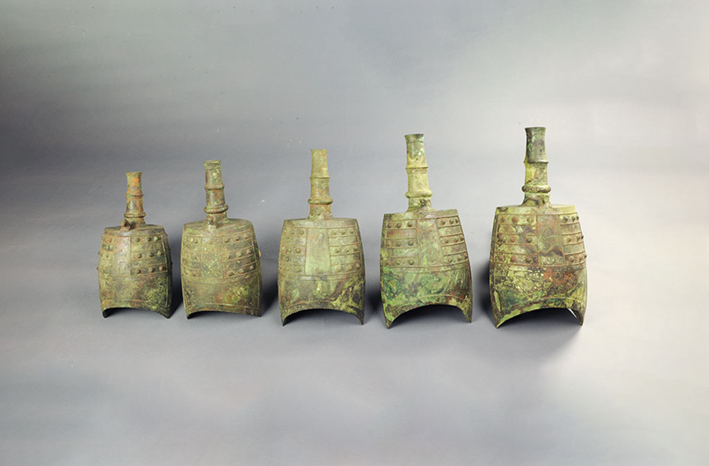 编钟是先秦汉代祭祀或王室宴会时必不可少的青铜打击乐器,因大小依次成组悬挂,所以称为编钟,斜挂称为甬钟,直悬称为钮钟。