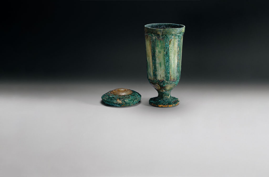 鎏金铜框的上截嵌有8块长方形玉片,下半截嵌入5块心形玉片,杯盖嵌入一块青玉。体现了汉代高超的镶嵌工艺水平。