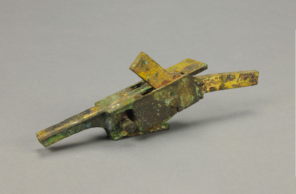 弩机装有“廓”,中有“牙”,用来钩弦,上是望山,作为瞄准器,牙下有“悬刀”,即为扳机。