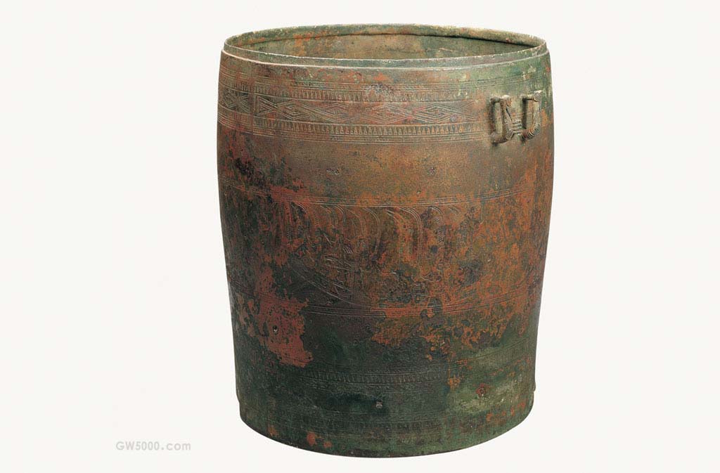 提筒在两广、越南等地均有发现,是一种极具越族特色的器物。南越国的提筒,应是作储酒之用。墓中出土大小不一的青铜提筒共9件,唯有这一件提桶四周有四组船纹。船体明显绘出甲板,船内分舱,满载战利品,其中的一舱内满是铜鼓,船旁还绘有海龟、海鱼和海鸟,并有“羽人”战士提敌首级或执宰俘虏等情形。从船上主要人物的活动来看,反映的可能是一支船队在战争结束后凯旋的场景,也有学者认为可能是在杀俘虏祭海(河)神。
