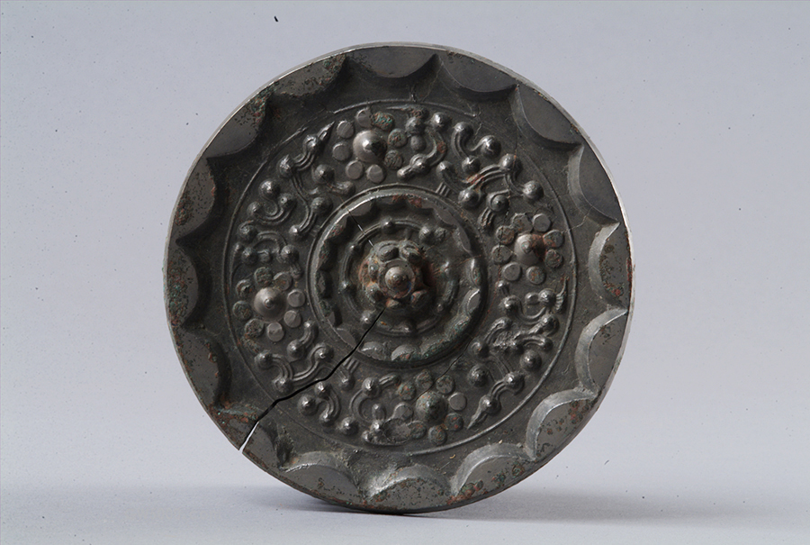 表面很光洁,镜面有一道裂纹,直径13.3厘米,镜为博山式钮,内区一周内向十六连弧纹,主纹区四方各有一连珠纹底座的乳丁,连珠纹之间分布有九枚曲线相连的乳丁,构成星云纹,内向十六连弧纹缘。