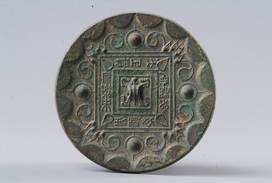 直径11.5米。伏螭钮方座,外饰凹弧面双线方框,方框外角各有一杏仁形花苞做饰,其间有十二字铭文: “大上贵,长乐未央,愿毋毋相忘。”铭文外有双线方框,方框外角各有一多层草叶花瓣纹,四面中央各有一带座乳钉,平缘饰内向十六连弧纹。以大自然的花瓣、草叶来修饰铜镜,这与之后的唐代花鸟镜有异曲同工之处。