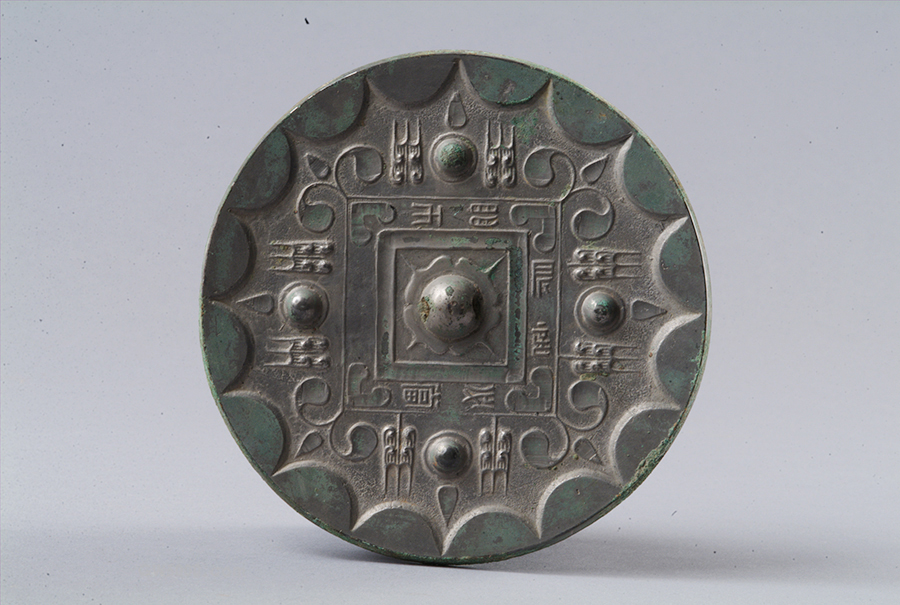直径13.78厘米。半球形钮,柿蒂纹钮座,座外凹弧面双线方框,方框其中三面各有二字,内容是:“之明,所言必当”,方框四内角各出一个桃形瓣图案,方框四外角伸出双瓣花枝纹,将空处分为四区,每区中部有一圆座乳丁,乳丁两侧各有一对双层草叶纹,镜缘为凸起的向内十六连弧纹。