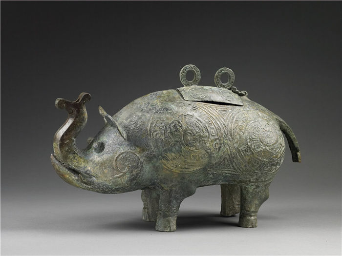 盛酒器。尊体作象形,象体肥硕丰满。方形尊盖置于象背,盖面有两圆环,圆环上接以链环与器体相连。象鼻高挑,中空,以鼻为流,象口微张,齿牙外露,两圆目突出,圆耳耸起,四柱足较短粗,象尾自然下垂。器盖饰四组卷体蛇纹,象身饰以云雷纹衬地的凤鸟纹,中间填以三角形几何纹,该件象尊造型设计独特,纹饰布局巧妙。
