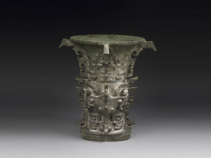 纹饰自上而下分为三部分:上段以扉棱为中心饰四个两两相对的蕉叶纹,其下饰两组蛇纹,蛇身曲折,尾上扬而内卷。中段以左右扉棱为界,前后各饰一组大兽面,以扉棱为鼻梁及额中线,兽面球状凸目,阴线勾“臣”字眼眶,浮雕粗眉,裂口,鼻翼翻卷,下额上卷,短齿微露,头上大卷角相内翻卷亦高出器表。圈足上壁以左右扉棱为界,前后各饰一组兽面纹,较腹部兽面简省。三段纹饰均以云雷纹填底。内底铸铭文122字,记述了周成王五年迁宅成周的重大史实。何尊兼具艺术与史料价值,是西周青铜器代表作之一。