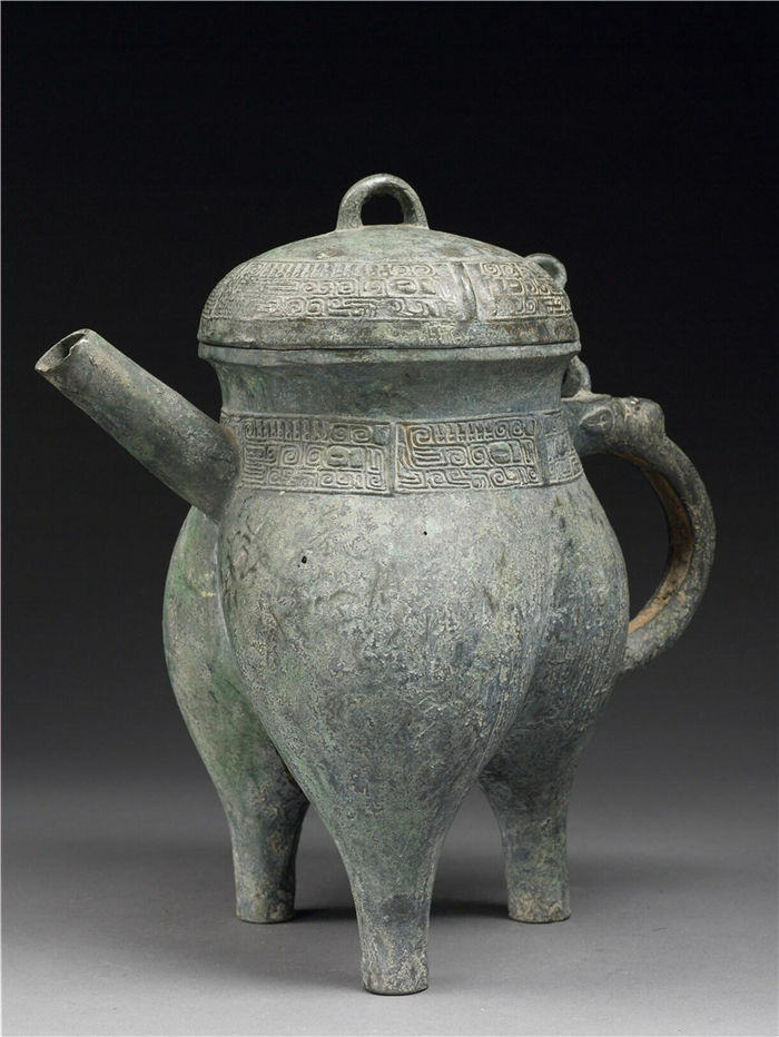 有盖,盖中部有半环形钮,侈口,束颈,深腹分裆,三柱足,颈部设一管状流,腹身有一牛头鋬,器、盖由一链钮和牛头单鋬连接。盖缘及颈部饰一周兽面纹,中有小扉棱装饰。腹底有烟炱,应是周人长期温水或温酒后的痕迹。