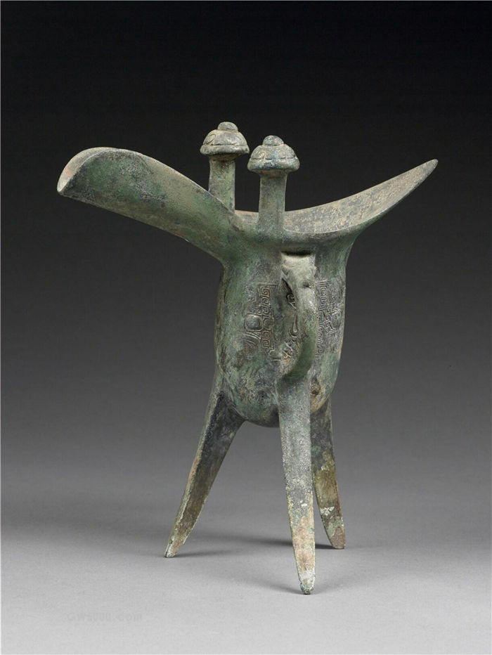 爵是目前所知最早出现的青铜酒器,通行至西周时期,西周中期以后基本不见。长流有尾,两菌柱立于流折处,腹身呈椭圆形,圜底,有一兽头銴,三刀足外撇。爵身饰两组兽面纹,兽目凸出,纹饰整体以云雷纹衬地,因长期使用,爵身纹饰已磨损不清。銴内铸有铭文“覃父癸”三字。