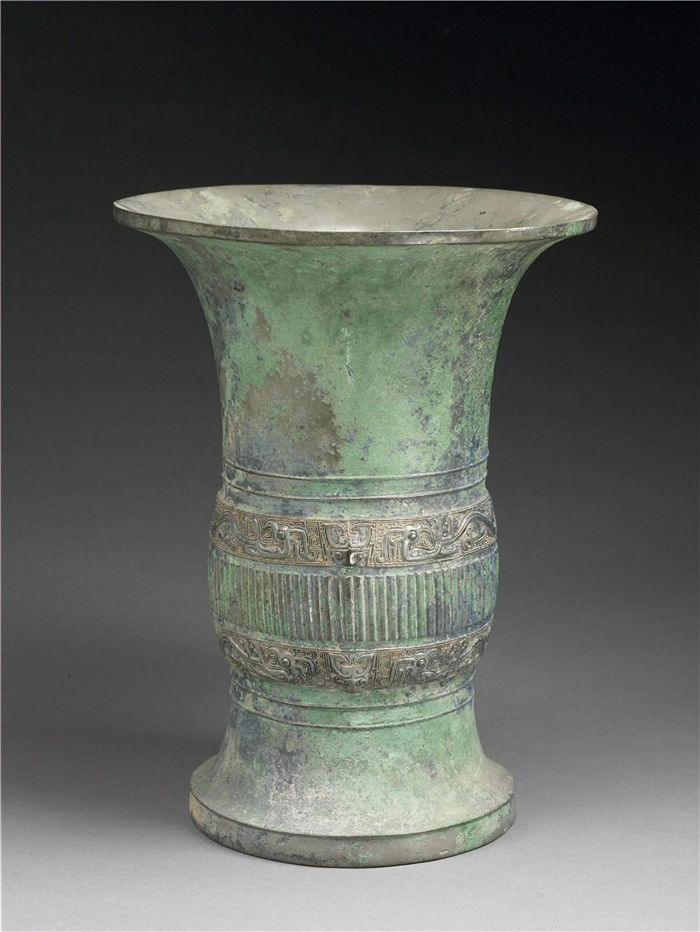 盛酒器。该器体呈圆筒状,敞口方唇,深腹微鼓,高圈足。腹上部及圈足处饰两周凸弦纹,内有两周回首凤鸟纹,凤鸟垂冠、长身,以云雷纹作地,中间有两对称兽首,两周凤鸟纹饰带夹一周细直棱纹。该器纹饰布局清晰规整,造型精美。