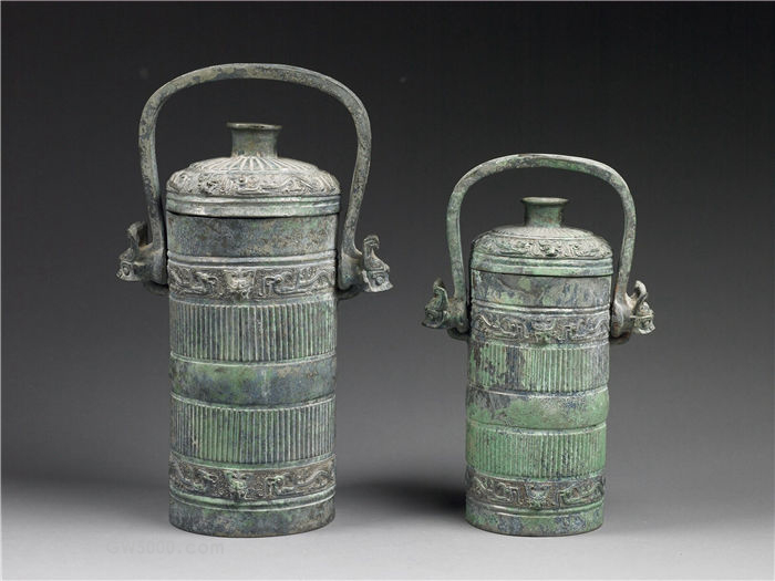 盛酒器。两件卣器形、花纹均相同,唯大小有别。卣体呈筒形,有提梁,带盖,卣身直口,深腹。提梁上有宽凹槽,凹槽中部内侧有凸棱三道,提梁两端有圆雕兽头。盖面隆起,盖中部有圆形握手,握手上有两对称穿孔,盖面饰一周辐射状梯形直棱纹,盖沿、器体颈部及近底部纹饰相类,均饰以云雷纹作地的夔凤纹,且前后均有两对称兽首。卣腹上部有对称两半环,用以衔接提梁首端,腹中部有两周直棱纹,中间夹一周凸起宽条带纹。圆筒状提梁卣较为罕见,主要见于商末周初。