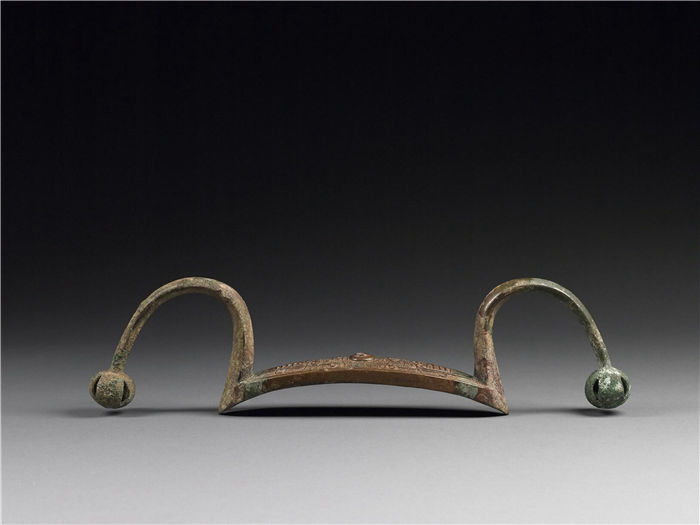 弓形器多认为是用来协助驾车者挽缰绳的器物,属车马器。弓形器体呈弓形,器身内壁凹下,上有三道脊棱,脊部隆起,中心处有一圆突,两侧饰蝉纹,纹饰整体有云雷纹衬地,弓身两端伸出连弧状曲臂,臂端有镂空小铃,内含弹丸。该器臂身的连接处均有明显捆缚痕迹。