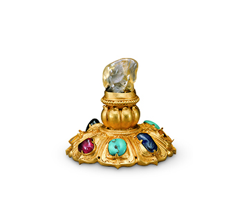 通高4.8、底径5.2cm帽顶由金镶宝石覆莲底座和淡黄蓝宝石顶饰组成,上存宝石7颗。