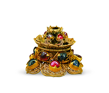 高3.4、底径5cm覆莲形金花底座自上而下采用“花丝工艺”镂空成五层,共镶有宝石18颗。