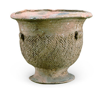 腹饰三个鼻状耳,器身饰叶脉纹。
