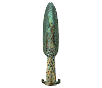 残长22cm双刃做柳叶状,骹做菱形饰以叶脉纹。