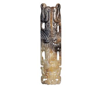 战国中晚期(距今约2320年),九连墩1号墓出土,羽人角形佩,长13.9,宽3.6,厚0.9cm