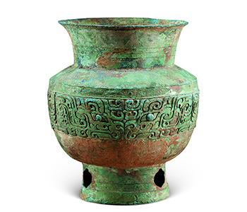 高28、口径20.8cm器身饰凸弦纹、饕餮纹,饕餮由云纹构成。足部有三个“凸”字镂孔。