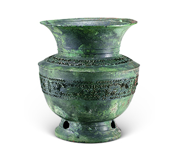 杨家湾7号墓出土高25、口径20.8cm该青铜尊为盘龙城遗址晚期器物,纹饰较为细密。肩部饰以凸弦纹、夔纹、联珠纹,腹部饰由三列夔纹组成的凸弦纹。