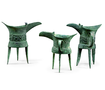 左:通高21cm中:通高14.4cm右:通高16.8cm左、中爵折腹,器身饰饕餮纹、夔纹。右爵弧腹,器身饰弦纹。