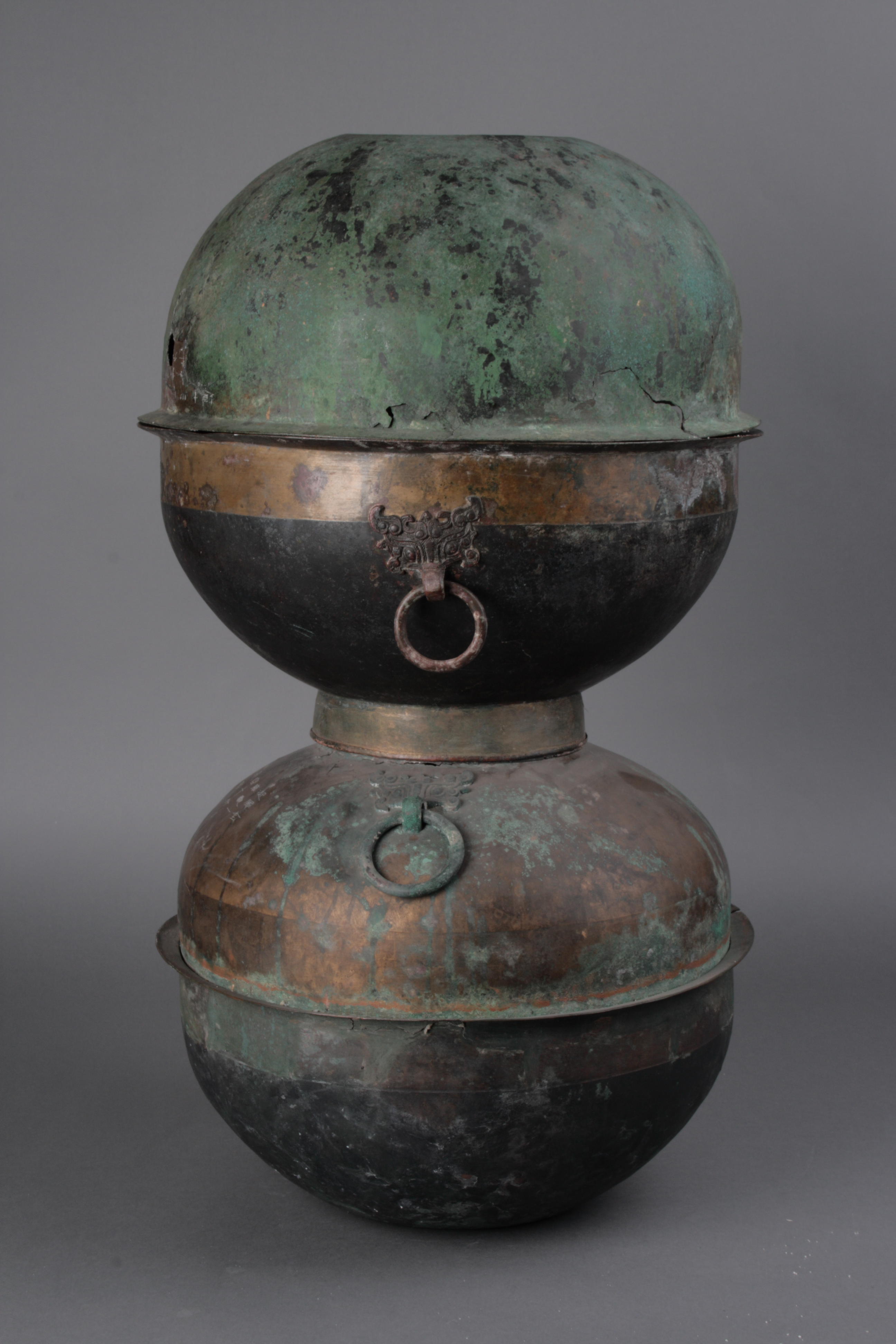 由釜、甑、盆三件组成一套。釜小直口,大圆腹,小平底,器腹中部外出一折沿。肩有用铆钉固定的铺首衔环一对。甑敞口,外折沿,小圈足套在釜的小直口外,无底,装一活动箅子。腹有铆合的铺首衔环一对。盆敞口,外折沿,小平底。釜、甑的上部、盆的口沿及内壁鎏金。釜的肩部和甑、盆的口沿下均刻铭文。此甗采用锤揲工艺制成,且自备一盆,极为少见。