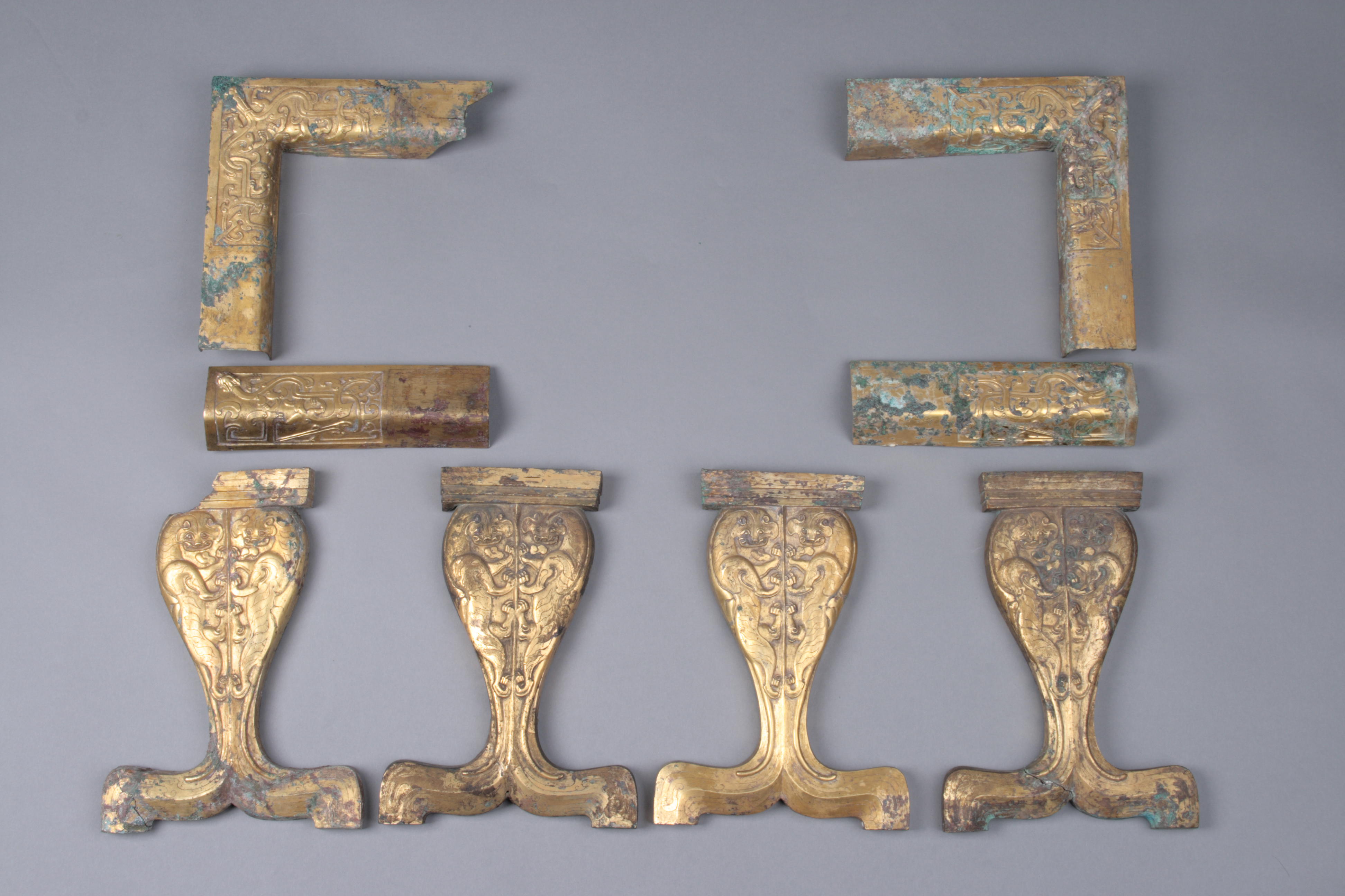 存案足和案栏各四件。案足的上部略横式长方形,中部上宽下窄如倒瓶形,下部分为人字形,足的断面作五角形。中部中间起脊,两边铸出对称的浮雕变形虎纹,上下两侧饰阴线流云纹,表面鎏金。案栏铜饰有直角形和长条形各二件,均鎏金。直角形饰饰边长18。6 宽4。5 高3。4厘米。长条形铜饰长18。5厘米。直角形为案栏角部装饰,上饰浮雕合身双躯夔龙纹,两端为阴线流云纹。长条形一端与直角形铜饰衔接。这些附件既能增加漆案的美观,又起到加固的作用。