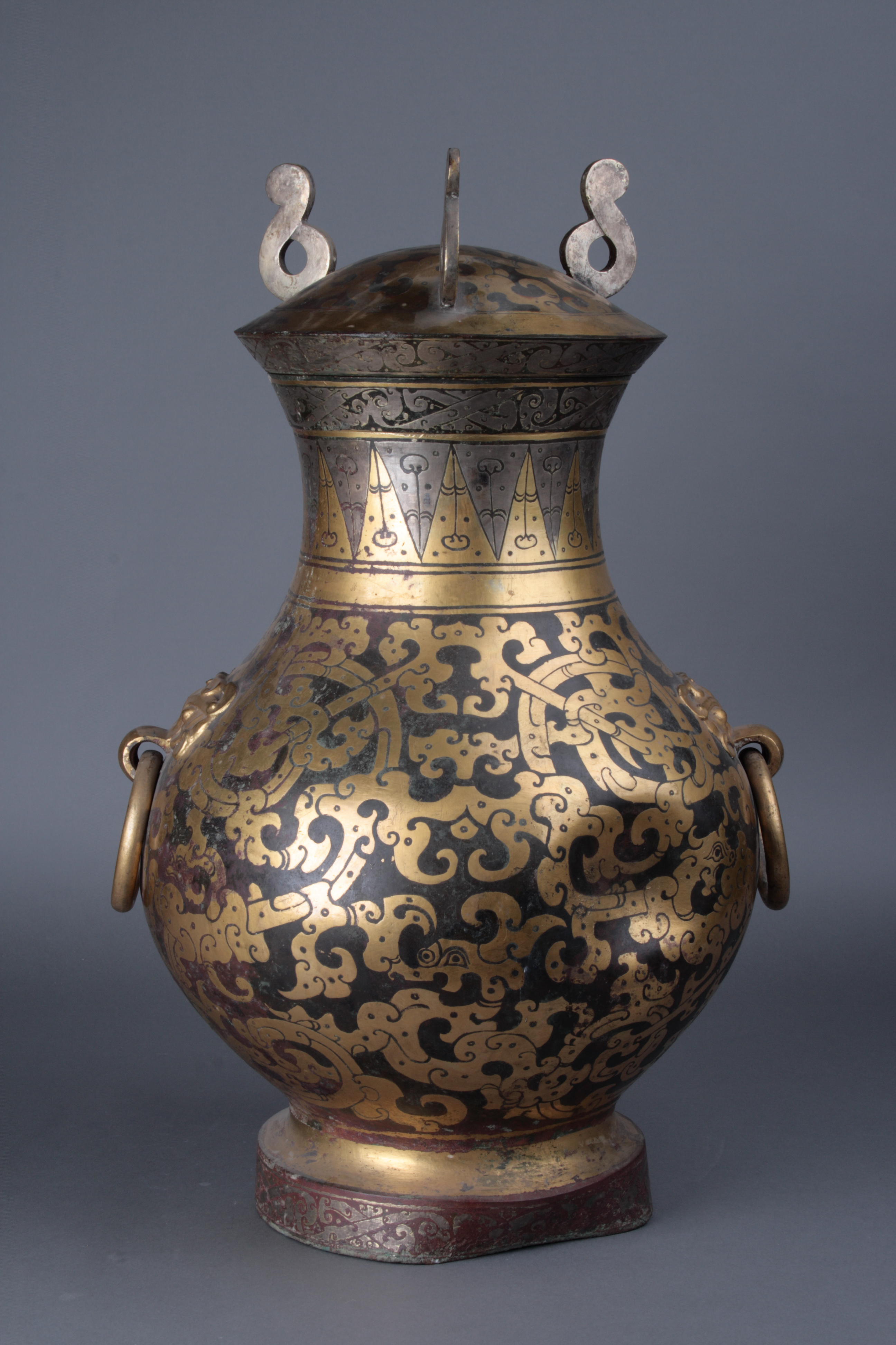 小口微侈 ,鼓腹圈足,上腹部饰一对铺首衔环。盖为弧形,盖缘下微敛,作子口纳入壶中。盖上饰三云形钮。盖面饰三只鎏金夔凤,盖纽鎏银。器身由上至下分为六层花纹。口部和圈足各饰鎏银卷云纹一周,颈部为金银相间的三角纹,颈下和圈足各有一条鎏金宽带。主体纹饰是腹部的鎏金蟠龙纹,四条粗大的独首双身蟠龙上下翻腾,左右环绕,龙间缀以流畅的金色卷云纹。器形硕大,气魄雄伟,金碧辉煌,雍容华贵。壶底刻铭文18字。据铭文研究,此壶原为楚元王刘交之物,后刘交孙刘戊参加"七国之乱"败死,朝廷当时没收了此壶,后转赐给刘胜