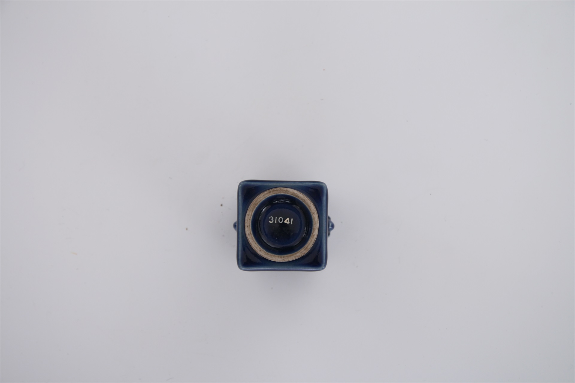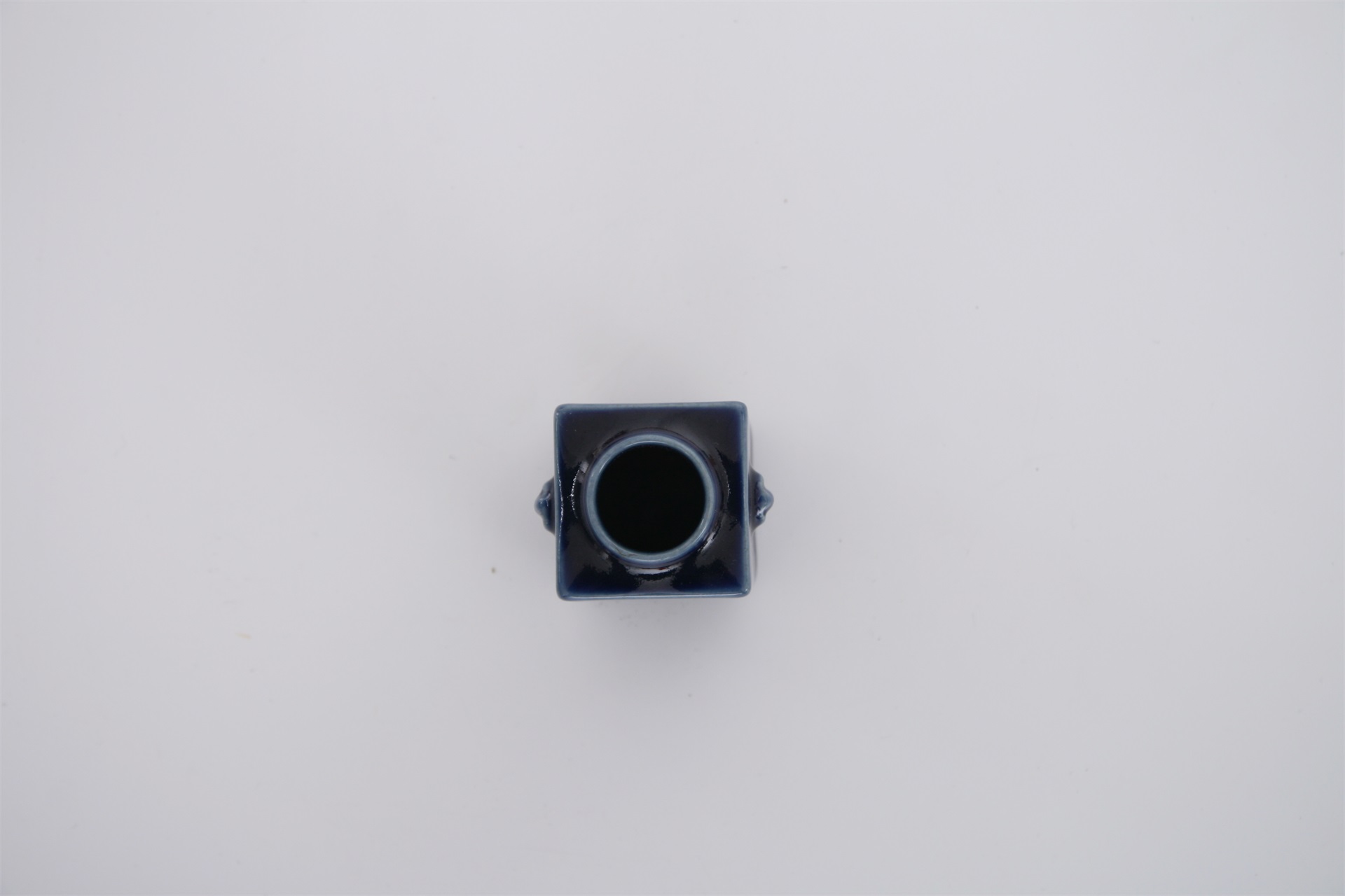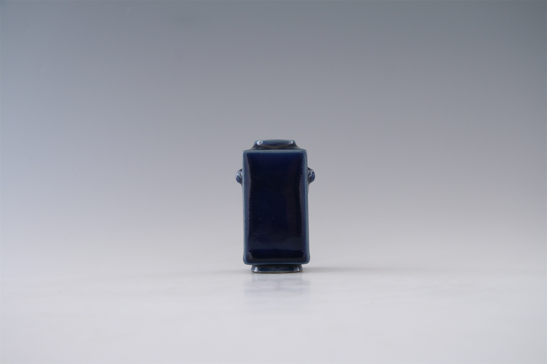 瓶圆口,方身,圈足。器身两侧塑有双兽耳。瓶身通体施霁蓝釉,釉质凝厚,色泽浓艳,如蓝宝石一般。在瓶身棱角、兽耳等凸处,釉层稀薄,隐现白色胎骨,饶有趣致。