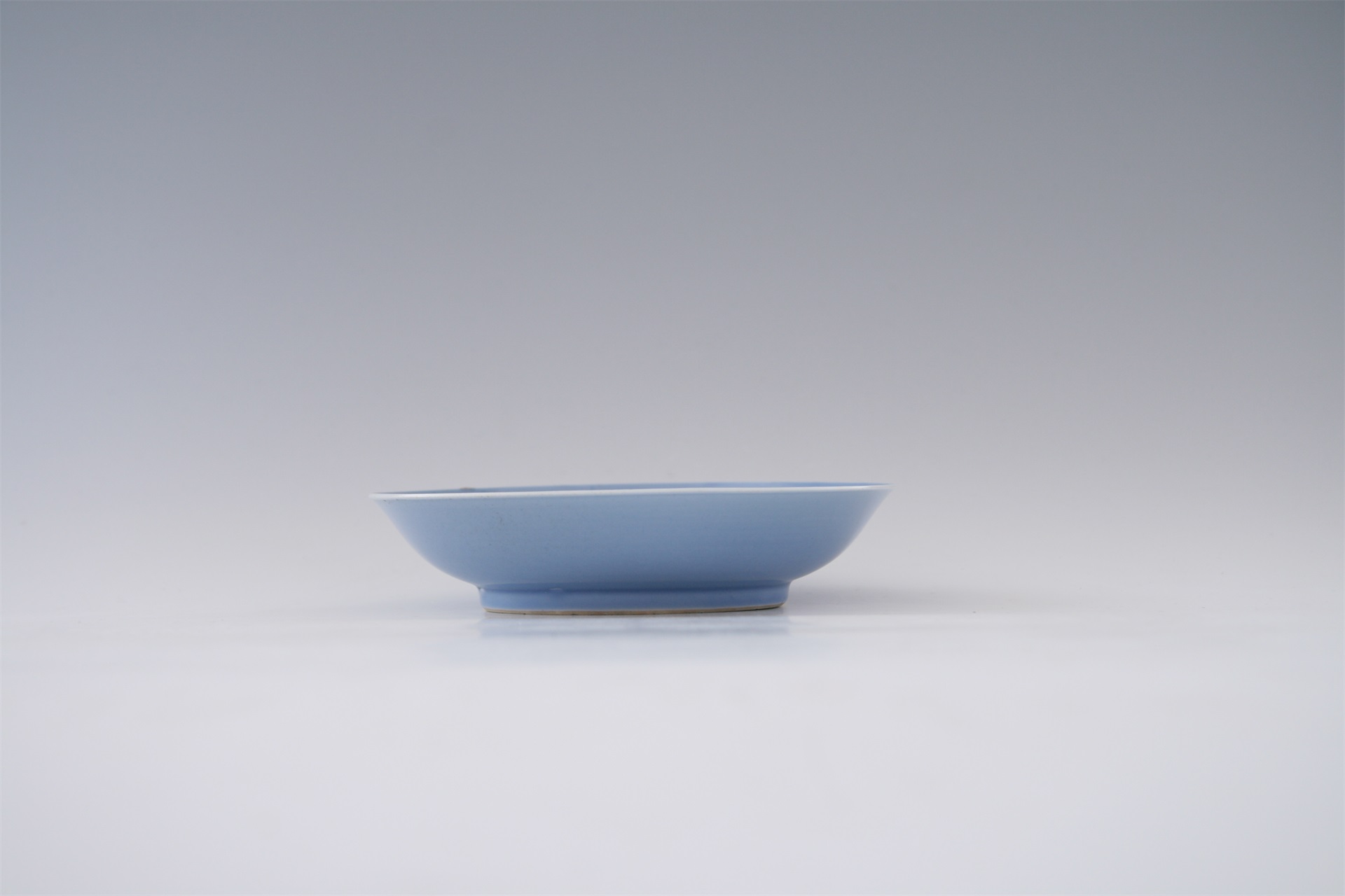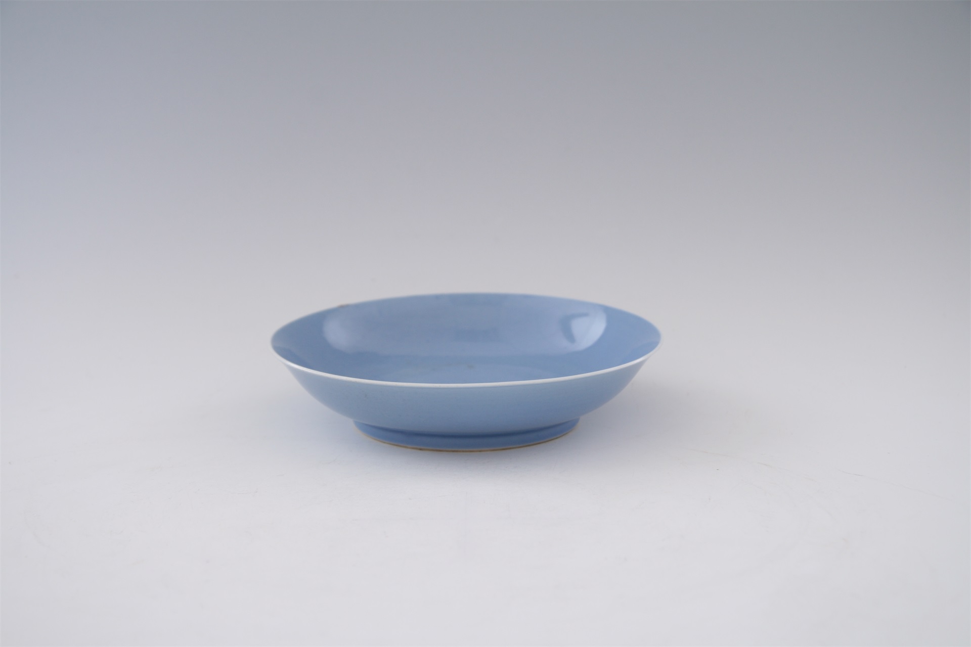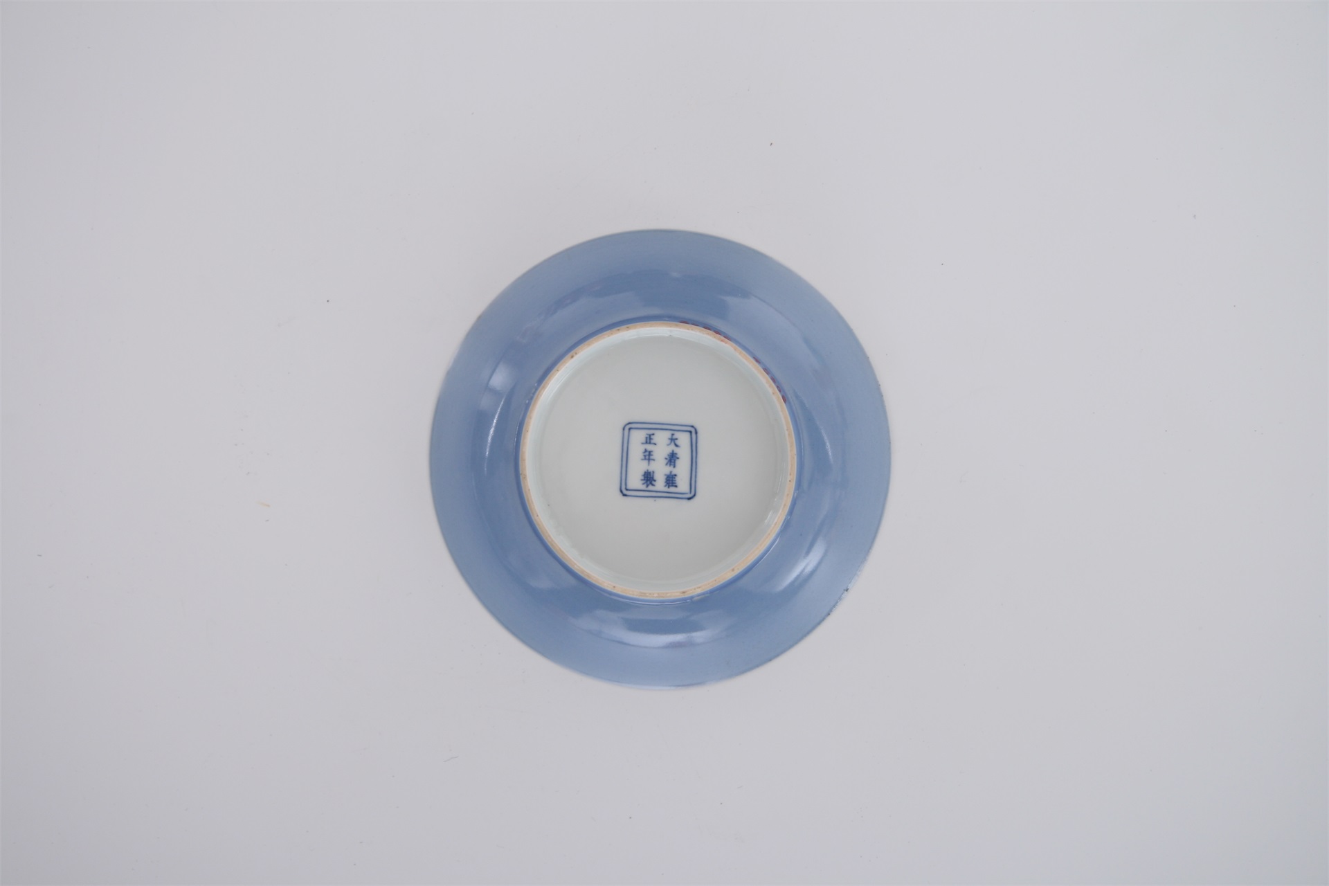 盘敞口,浅腹,圈足。器内外壁施天蓝釉,釉面匀净,釉光润泽。胎体轻薄,紧密质坚。器外底白釉地上的青花双方框内署“大清雍正年制”楷书六字双行款。