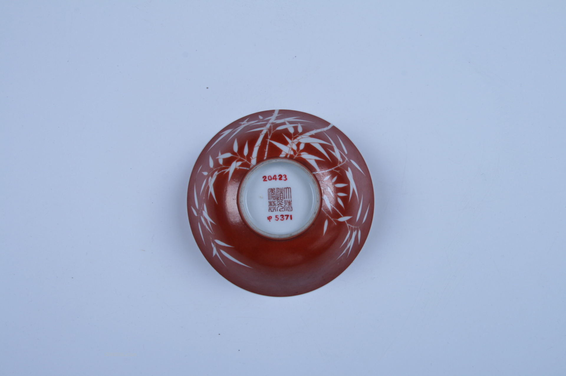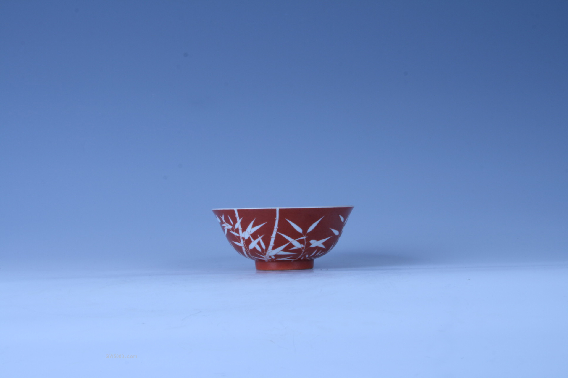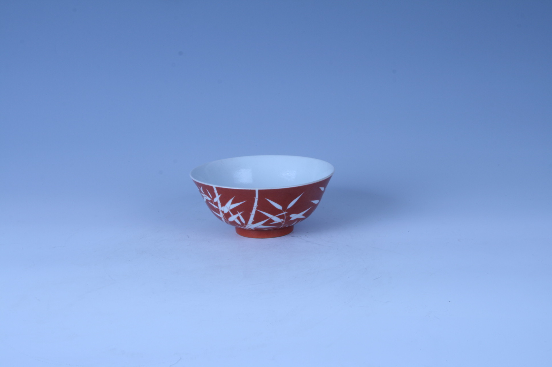 碗敞口,深腹,圈足。器内施白釉,外壁留白装饰出竹枝、叶纹饰,再以珊瑚红釉施满器壁,釉面匀净,色泽艳丽。白竹与珊瑚红地形成鲜明对比,构思巧妙。圈足内白釉地中心署有“大清道光年制”六字篆书款。