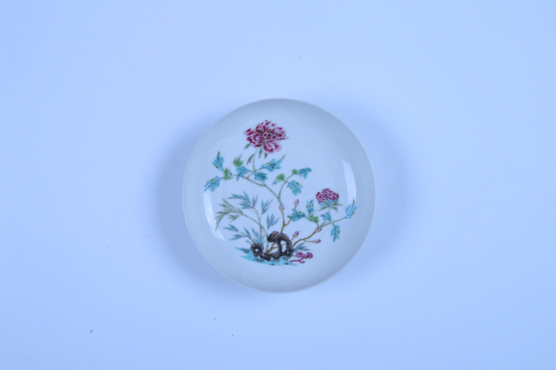 盘敞口,弧壁,浅腹,圈足。胎体轻薄,胎质细腻。通体施白釉,以粉彩为饰。盘心绘一株牡丹倚洞石袅然而生,侧有修竹、灵芝相伴。枝叶、花瓣以色彩深浅来表现阴阳向背。所施粉彩淡雅清新,构图疏朗有致,外底青花双圈内署“大清雍正年制”六字双行楷书款。