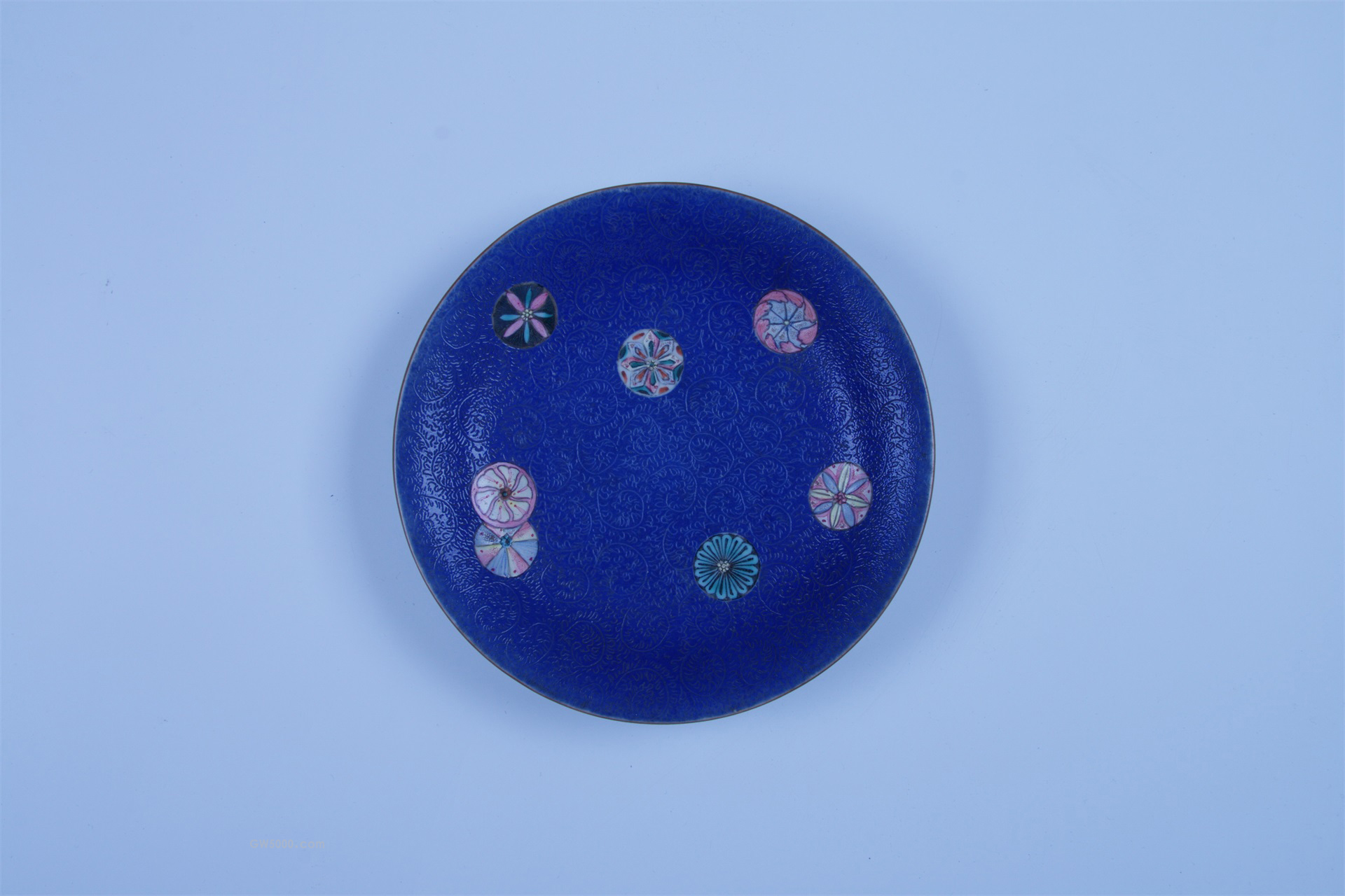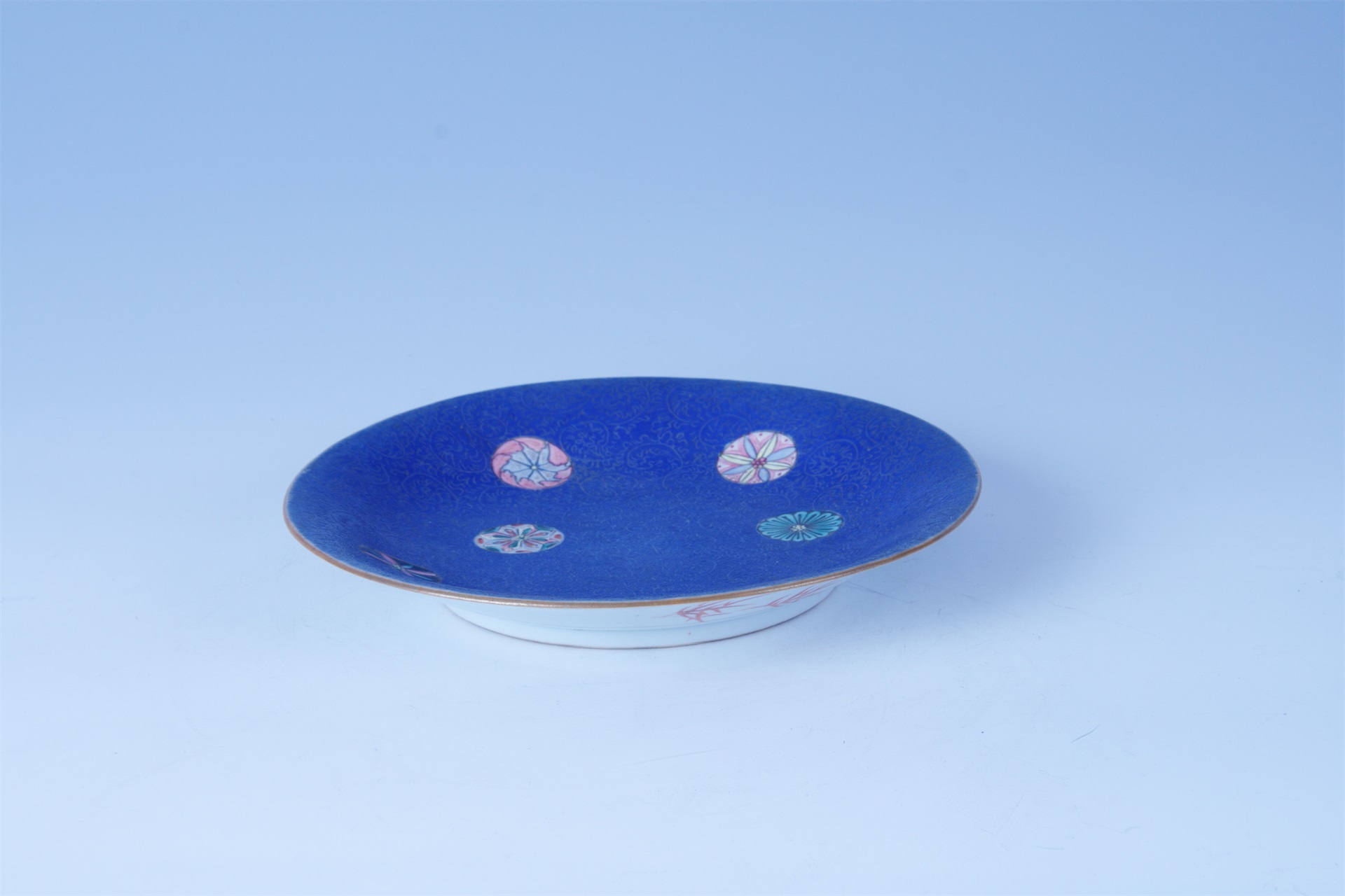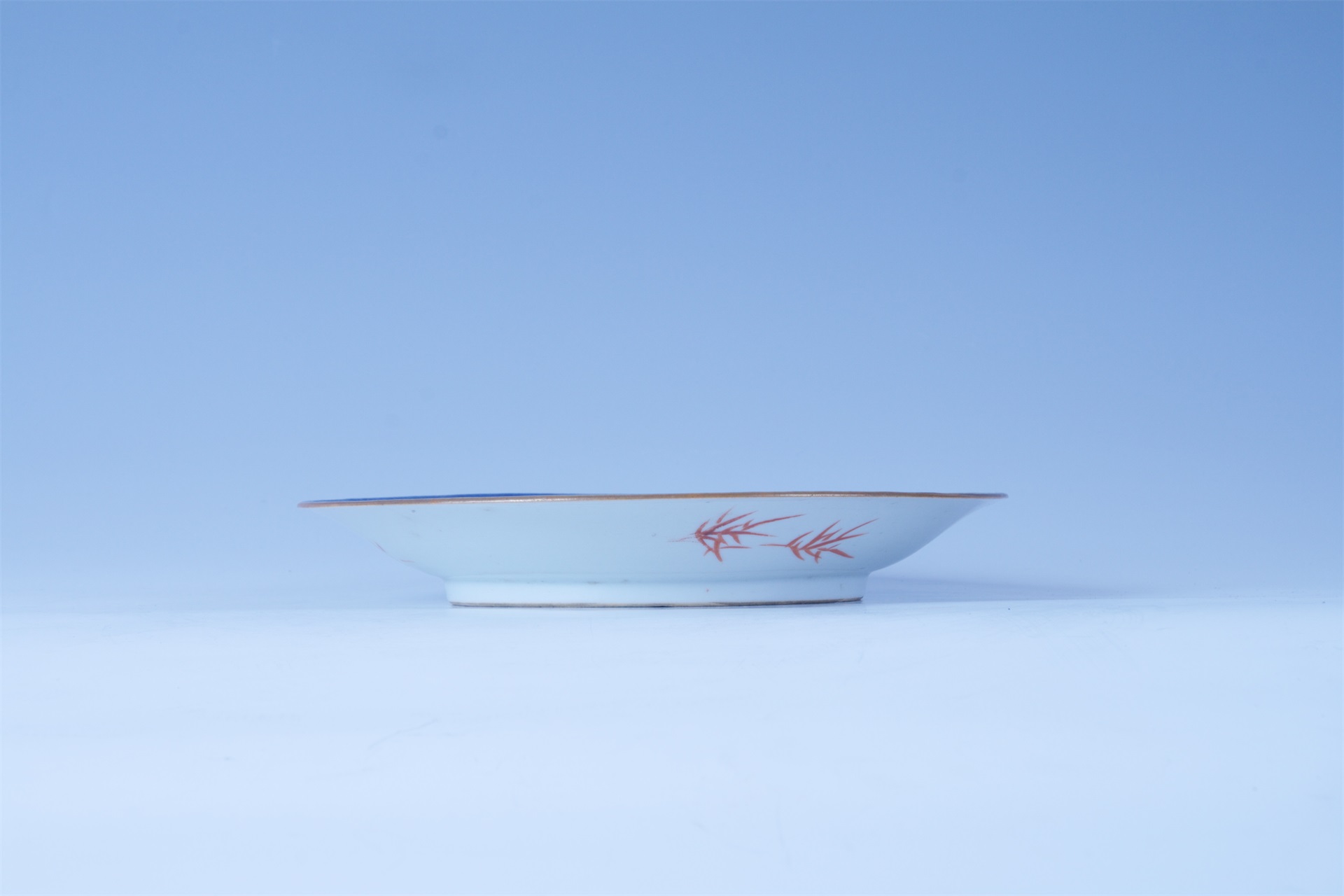 盘敞口,斜壁,浅腹,平底,圈足。内壁以蓝轧道纹为地,上以粉彩绘七个颜色各异的皮球花,外壁以矾红彩绘三组竹叶纹,外底书“大清乾隆年制”六字三行青花篆书款。此类轧道纹装饰为乾隆朝首创,蕴含“锦上添花”之吉祥美意。
