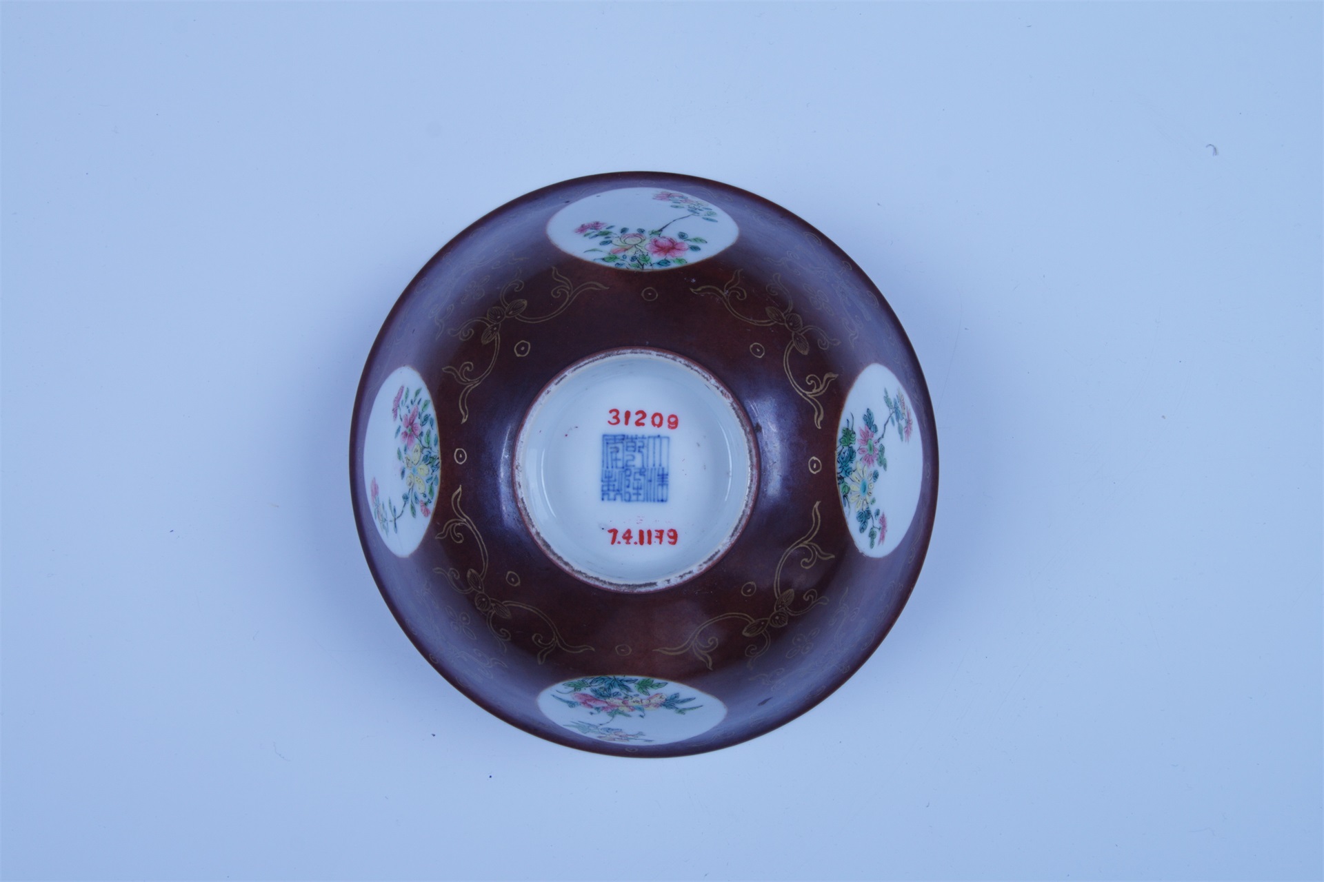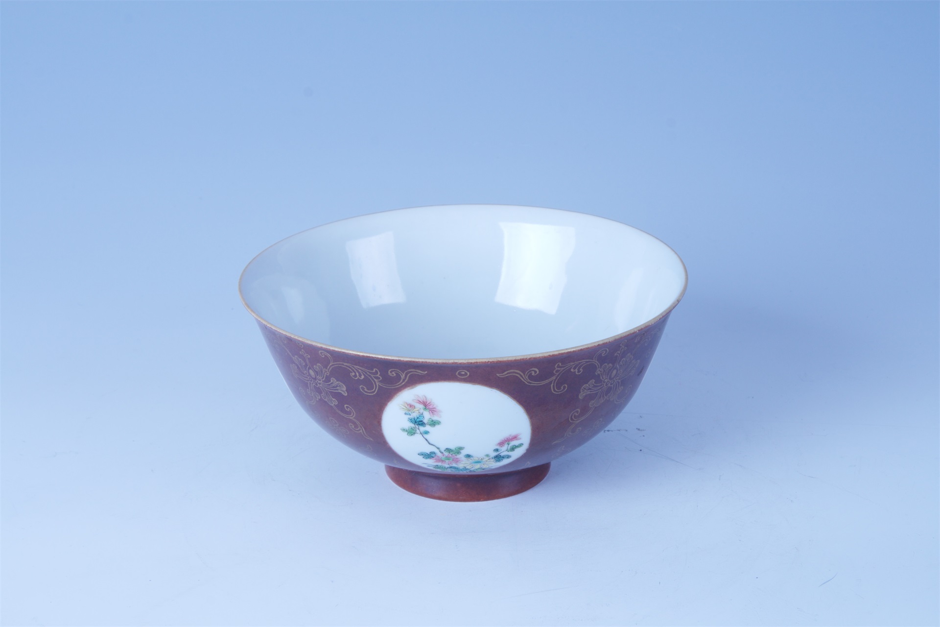 碗侈口,弧壁,深腹,圈足。内壁施白釉,口沿描有一圈金彩。外壁酱釉地上以金彩绘有缠枝宝相花,四个圆形开光内分别会有粉彩折枝花卉,圈足内以青花书有“大清乾隆年制”六字三行篆书款。
