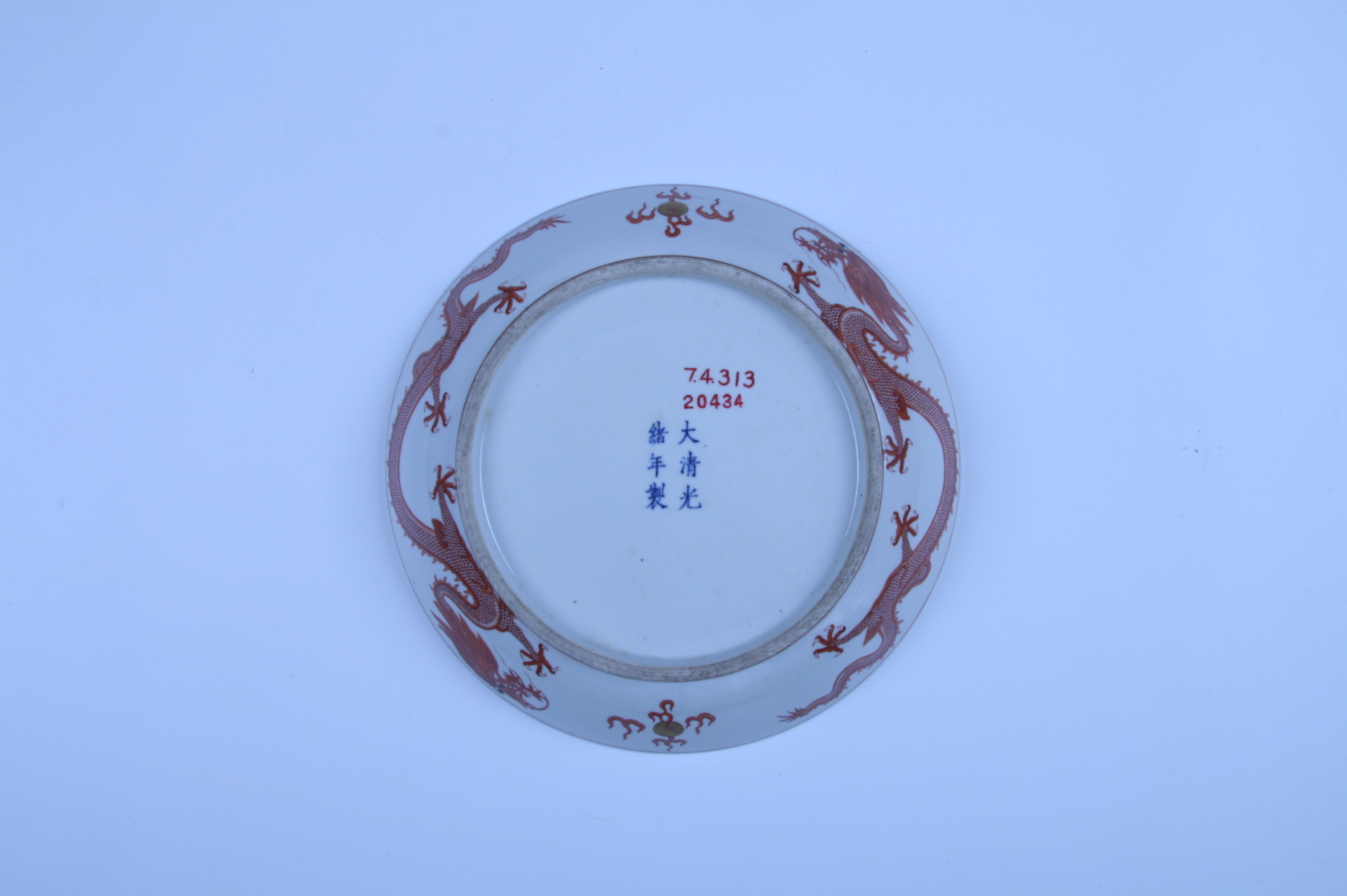 盘撇口,弧壁,浅腹,圈足。通体以白釉为地,内外壁以矾红彩绘首尾相追的双龙纹,间衬火珠。盘心绘红鲤鱼,穿游在浪涛中。所绘纹饰工整,线条流畅。盘外底中心处以青花署“大清光绪年制”竖排双行六字楷书款。