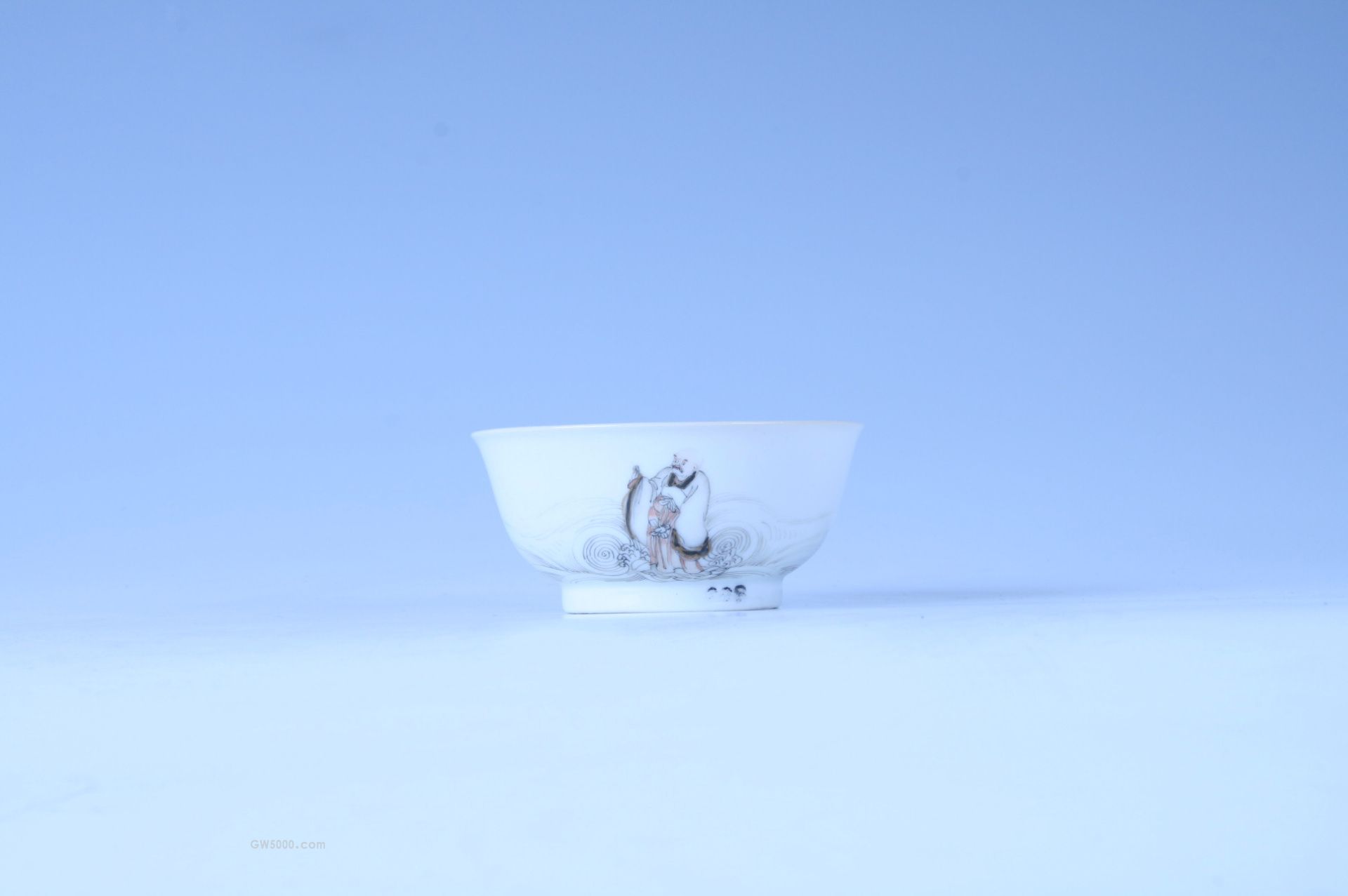 碗口微侈,垂腹,圈足。器外壁白釉地上以浓淡相间的墨彩、矾红彩勾勒人物,其身穿宽袖长袍,行走在波涛海浪中,所绘人物神态安详,绘法细腻。碗底青花双圈内书有简笔款。