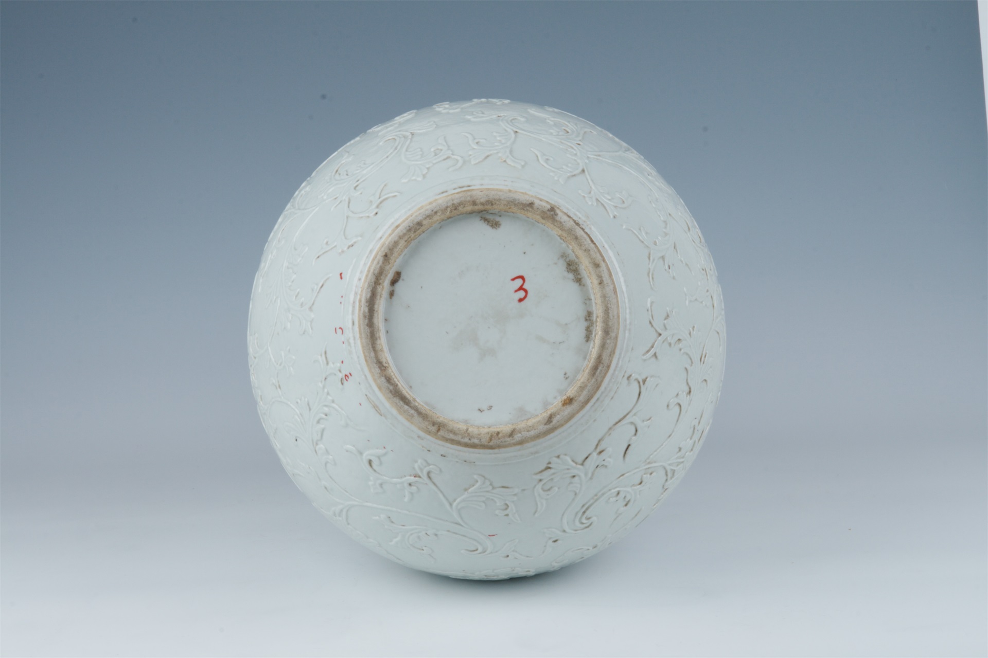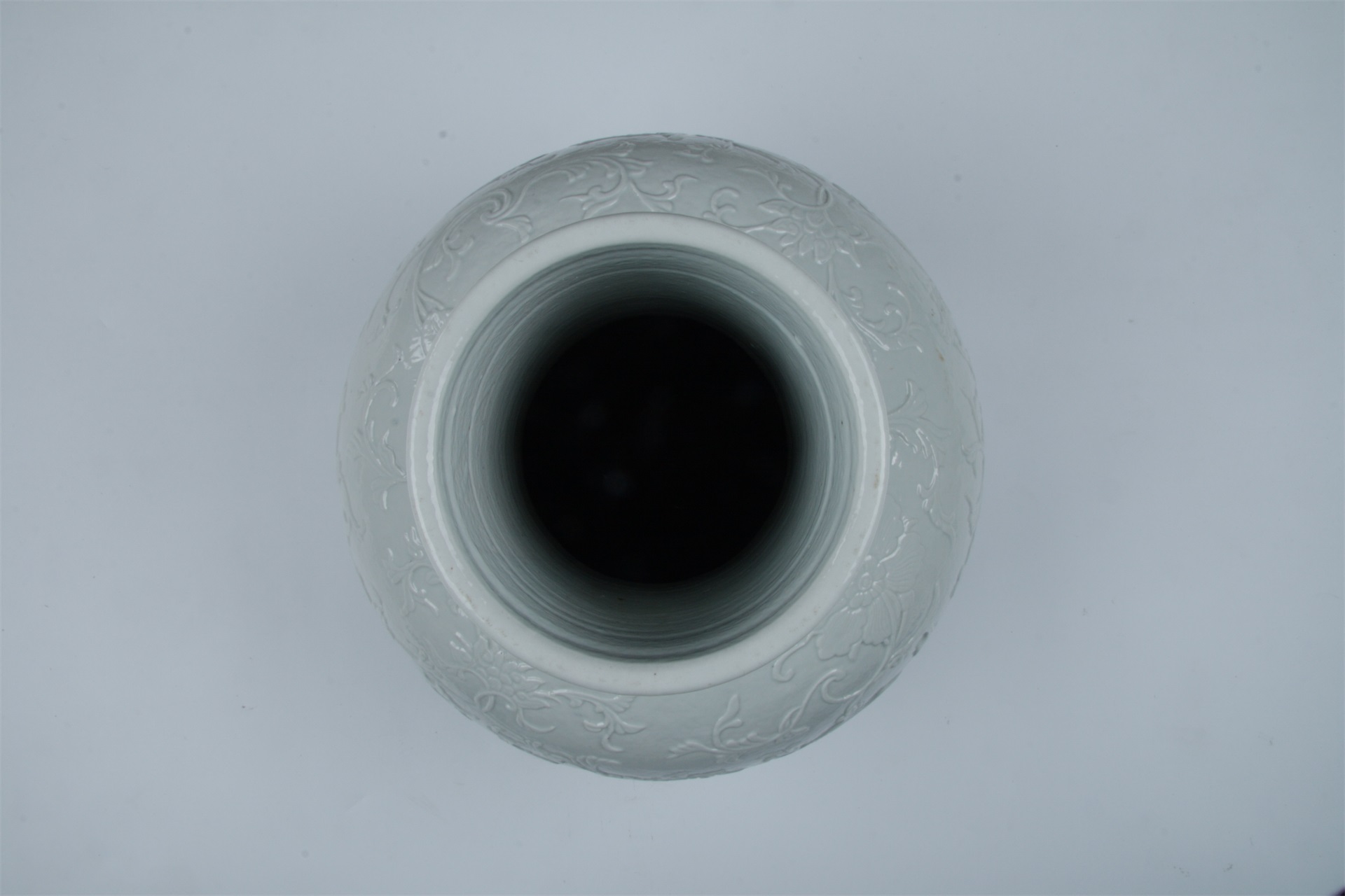 瓶直口,圆唇,直颈,丰肩,圆腹,圈足。通体施白釉,釉色洁白,莹润光亮,釉层厚薄均匀。胎体上饰满浮雕缠枝莲花纹,枝蔓缠绕,富有弹性。足端无釉,露出白色胎体,胎质细腻坚质。