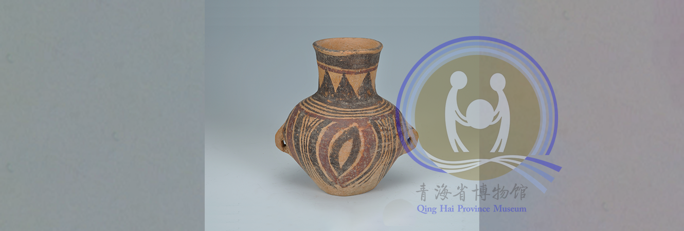 同德宗日遗址出土。泥质彩陶,直口,高颈,鼓腹,平底,腹部置有对称双耳。黑红两彩。口部饰带纹,颈部饰大三角纹,腹部为重环式贝纹。黑红彩相间,对比鲜明,纹饰特殊少见。