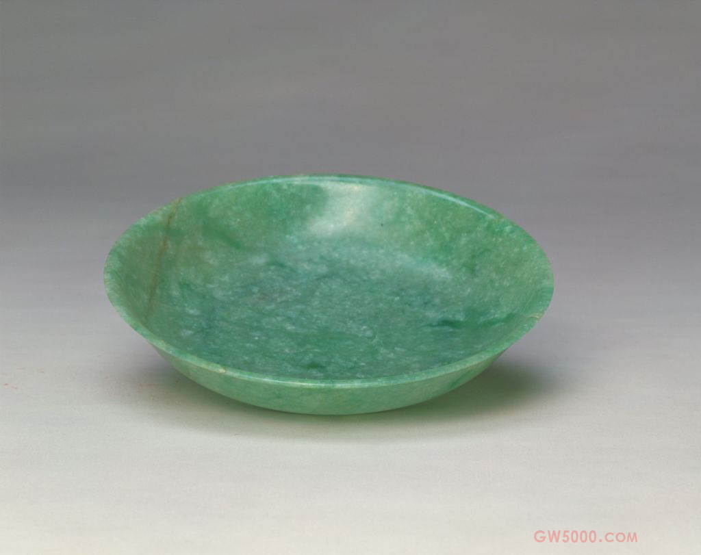 盘为翠玉质。翠绿色中间有白斑和绺纹。器形为圆形,浅敞口,通体光素,底为浅圈足。