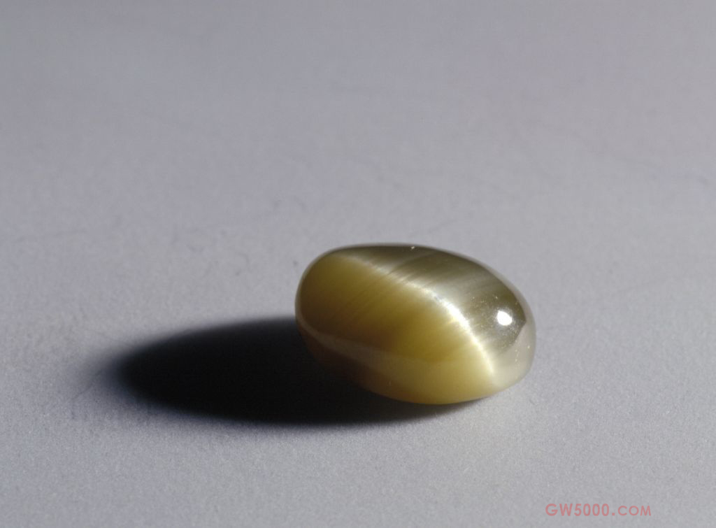猫睛石,清,高0.69厘米,长1.44厘米,宽1.06厘米。重11.77克拉。 猫睛石呈椭圆形,在光照下可清晰地看到光带闪动,成色上佳。猫睛石,矿物名称为金绿宝石。由于其内部含有金红石的针形内含物或羽毛状的流体内含物,从适当的角度看,折射光会形成一条明亮的光带,并可随光线的移动而发生变化,似猫的眼睛,故名。猫睛石是五大珍贵宝石之一,主要产于斯里兰卡、巴西和中国等地。