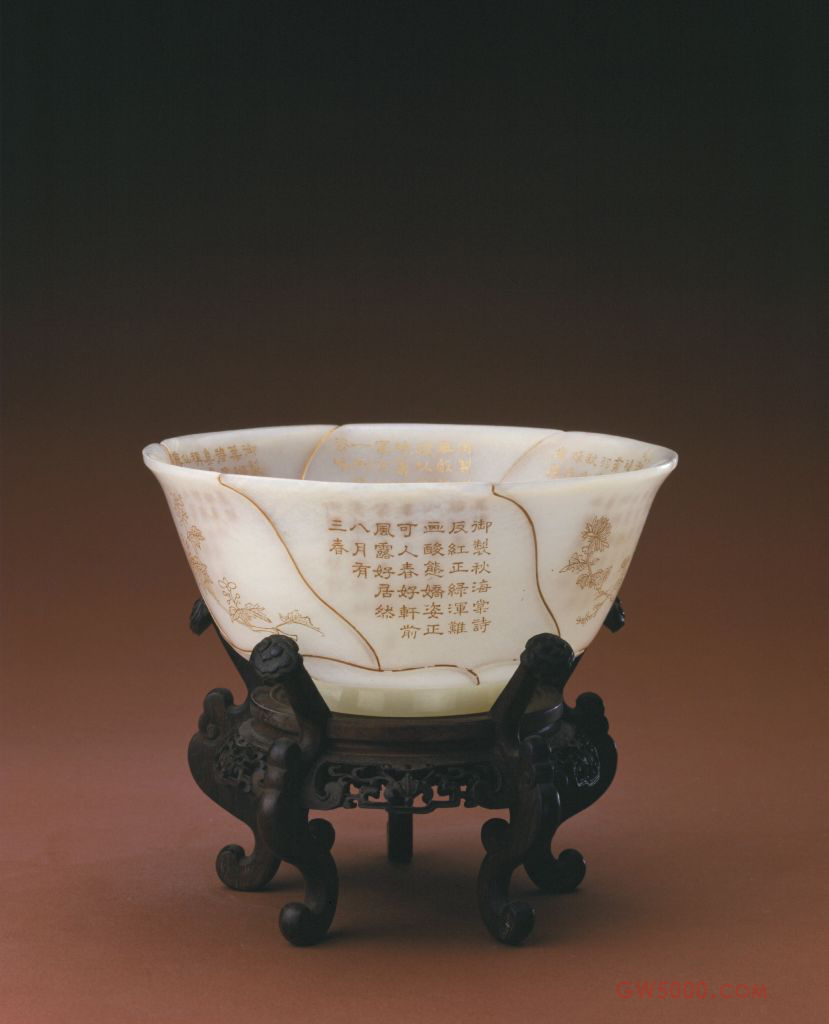 白玉填金花卉诗句葵瓣碗,清,口径15厘米,底径6.7厘米,高6.7厘米。