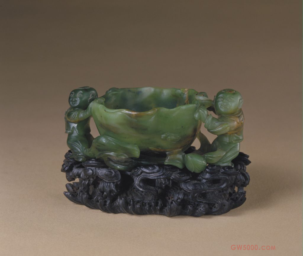 碧玉镂雕双婴耳荷叶杯,清,口径6.8厘米X6厘米,高4.2厘米。